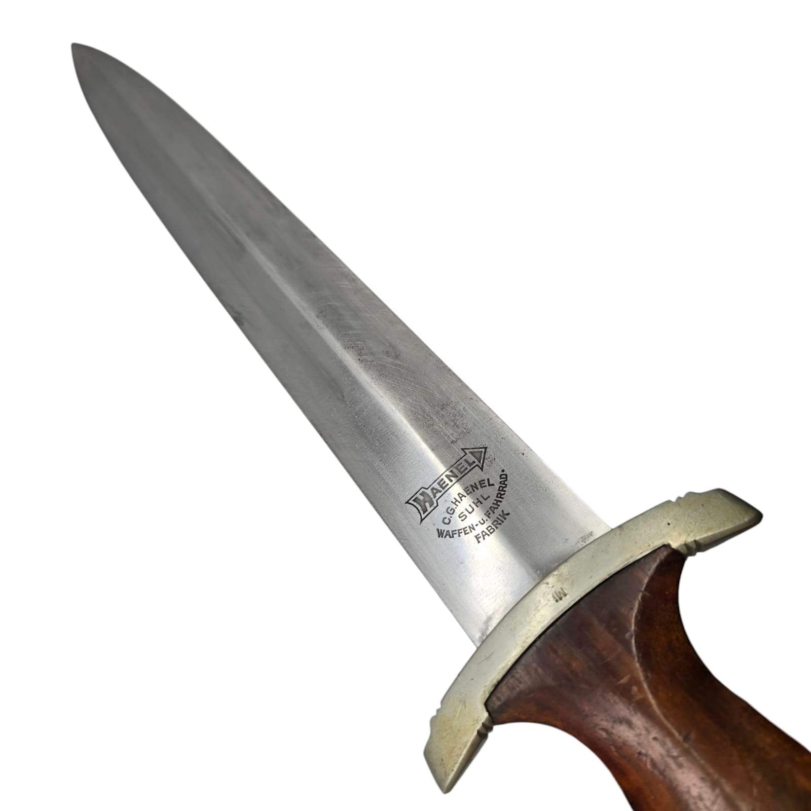 Condition: SA Service Dagger M33. Early period, produced between 1933-1935 by Haenel from Suhl. The blade shows signs of wear and use but remains in good condition. The front side is deeply etched with the SA motto: “Alles für Deutschland”, and the reverse side bears the correct manufacturer’s logo of Haenel.