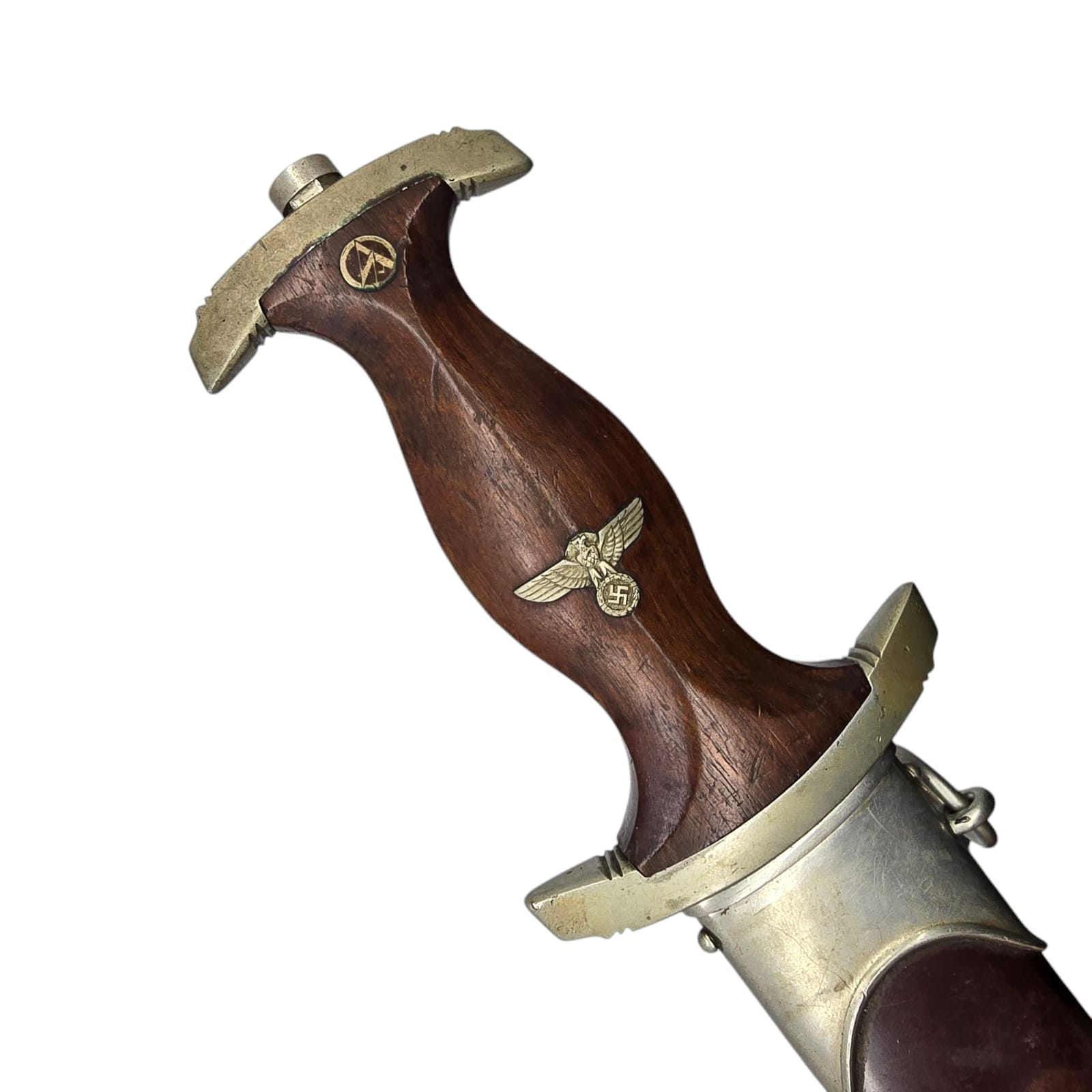 De houten greep heeft de correcte vroege nickelsilber Hoheitsadler en een onbeschadigd geëmailleerde SA-pastille. Beide zijn origineel geplaatst.