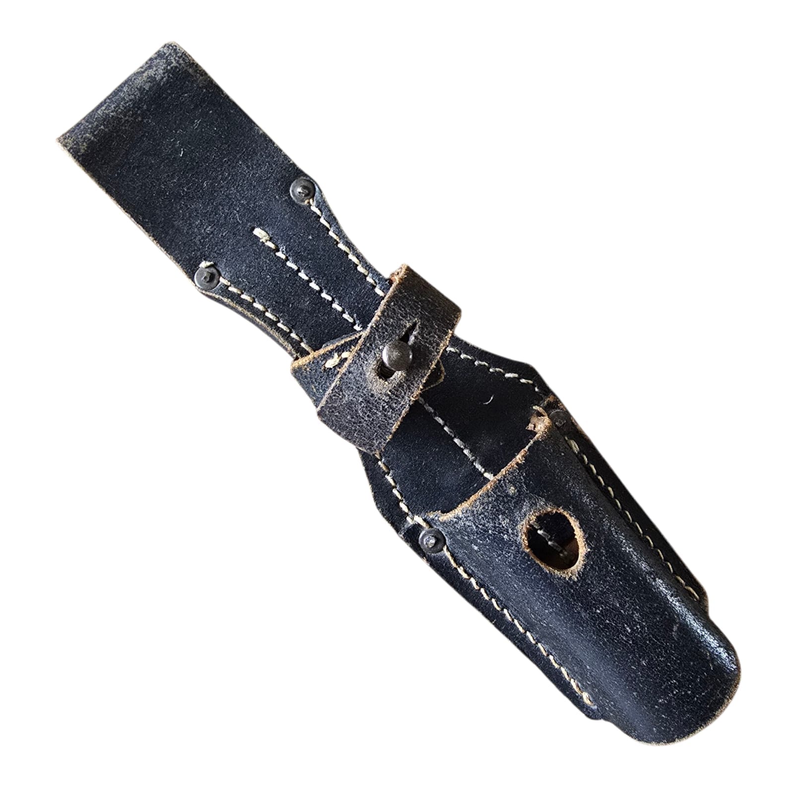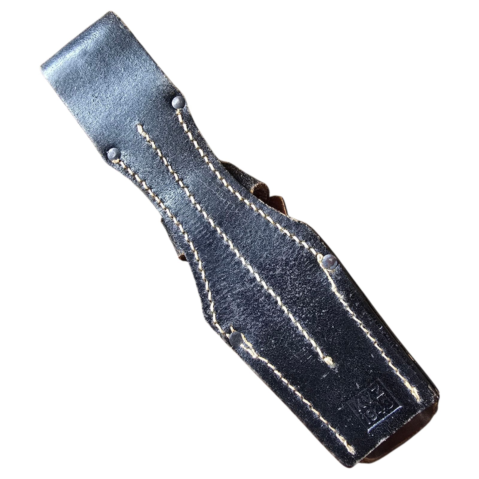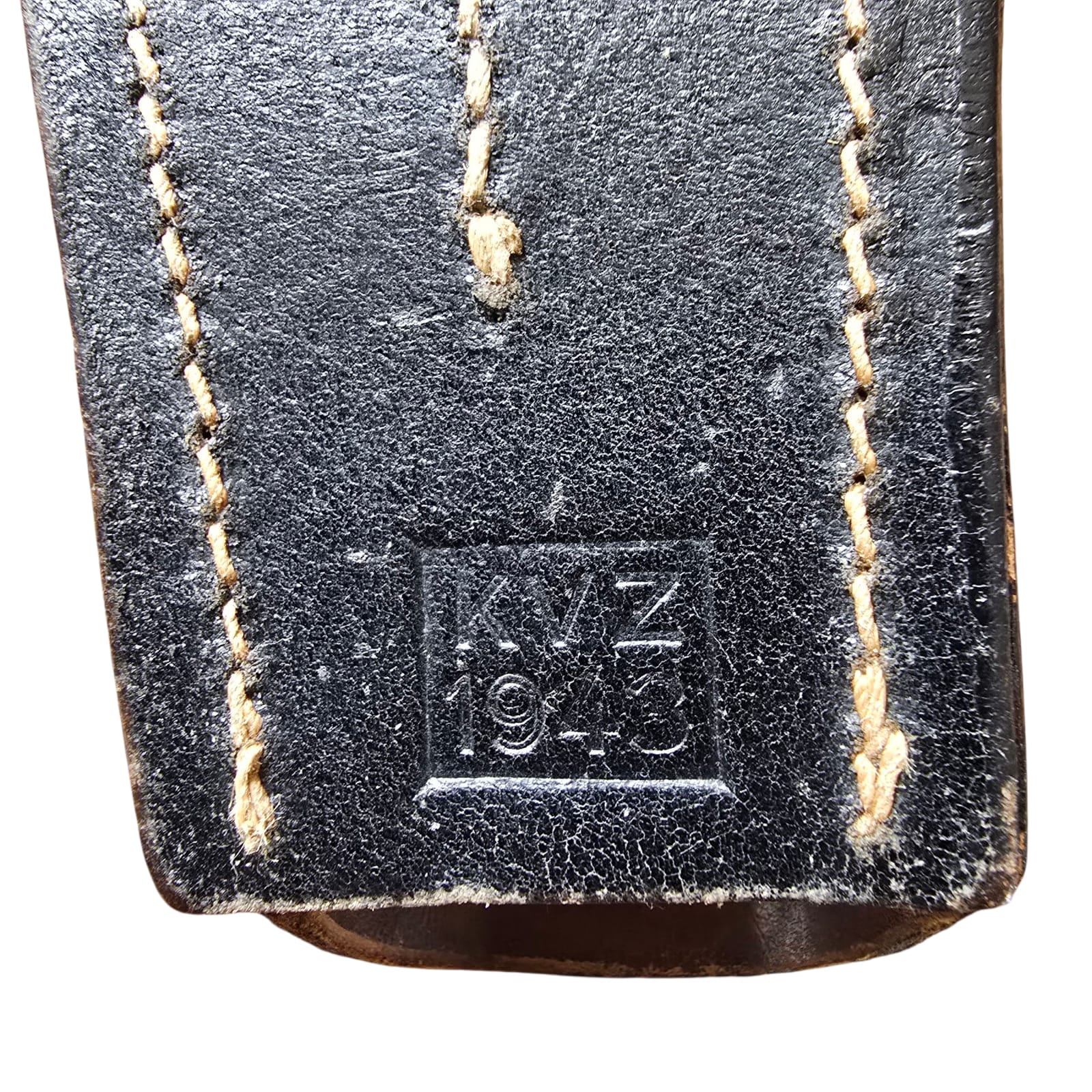Item: Wehrmacht K98 leather bayonet frog, marked ‘KVZ’ and dated 1943. This leather frog was used by the German Wehrmacht to carry the K98 bayonet on the equipment belt. It is marked with the code ‘KVZ’, indicating the manufacturer, and dated 1943, right in the middle of World War II. Such frogs were standard equipment for German infantry and were often worn in combination with the entrenching tool carrier.