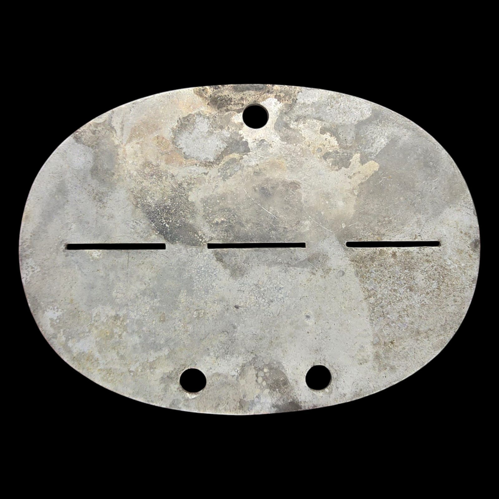 Item: German dog tags (Erkennungsmarken) from World War II were used to identify soldiers in case of injury or death. Made of aluminum, zinc, or steel, they were oval and featured a perforated middle, allowing them to be broken in half—one part remaining with the soldier and the other collected for records. The tags were stamped with the soldier’s unit, identification number, and sometimes blood type. Different branches of the Wehrmacht, SS, and Luftwaffe had variations in design and markings.