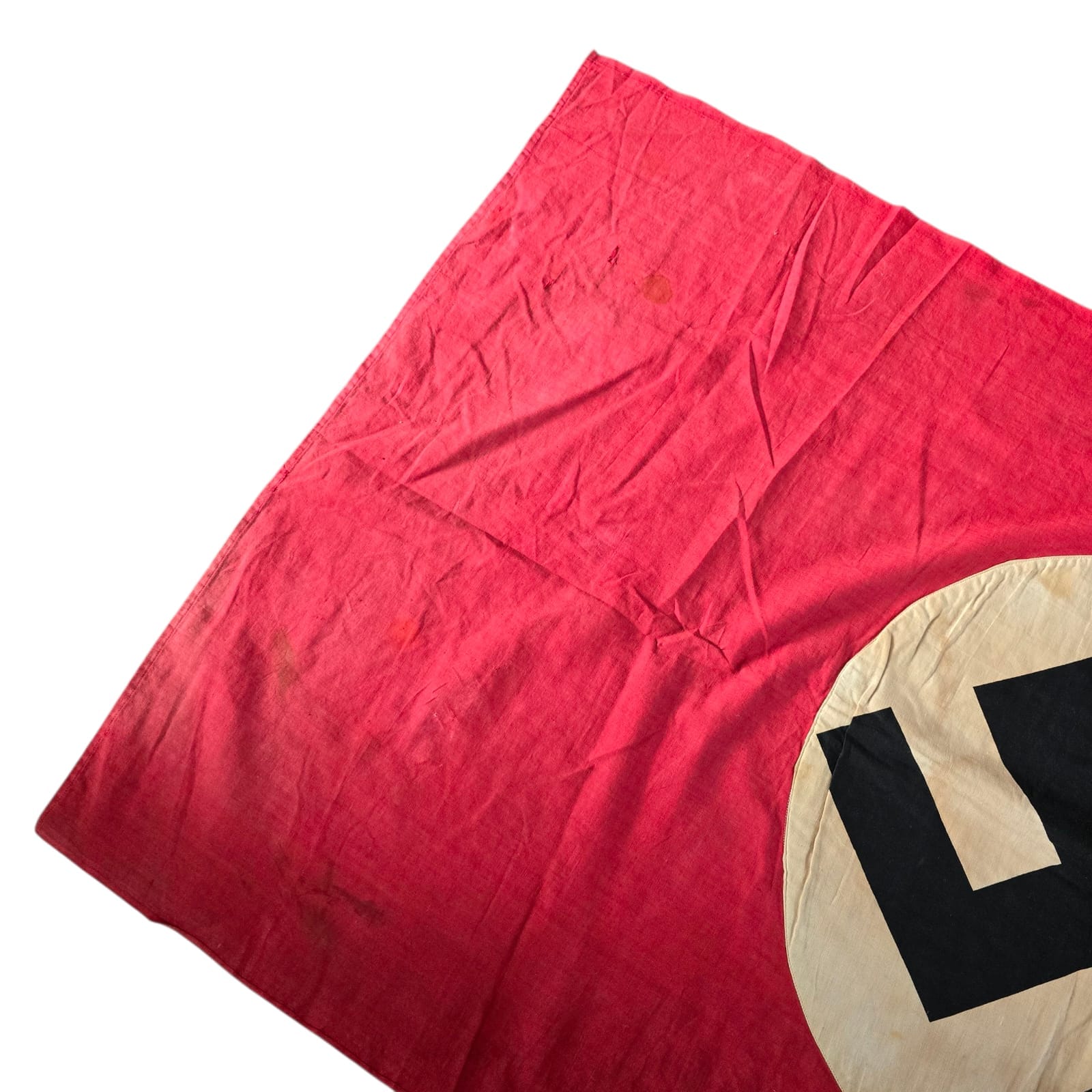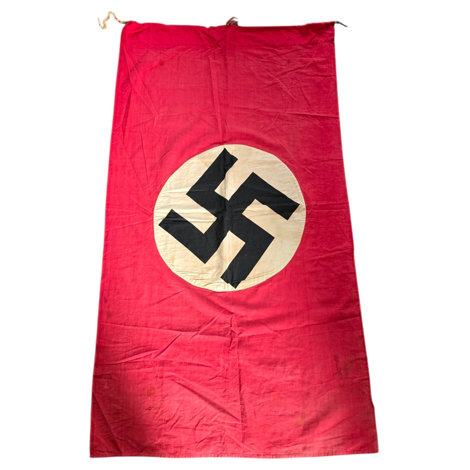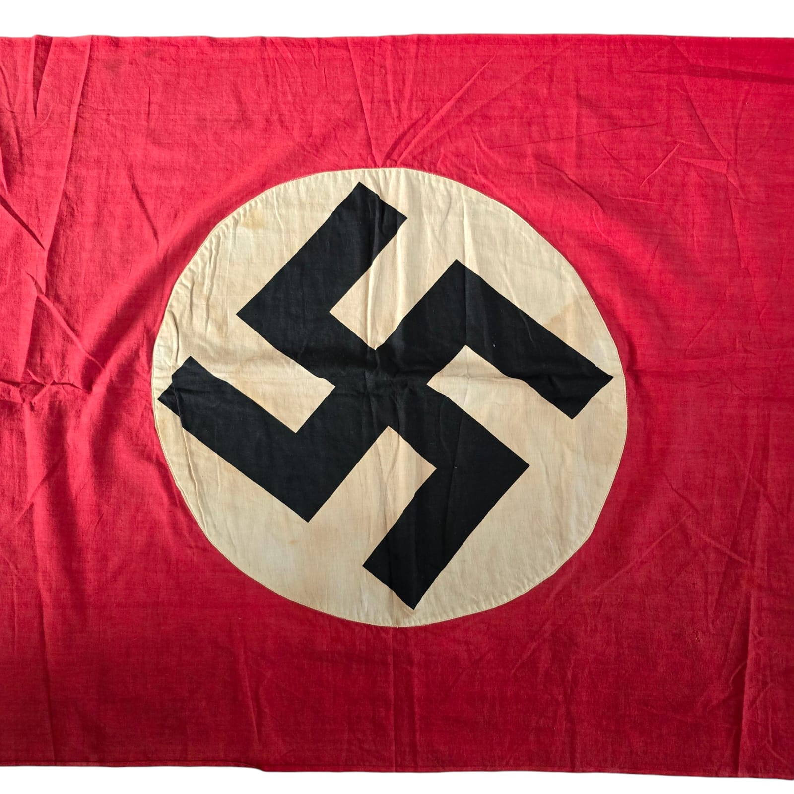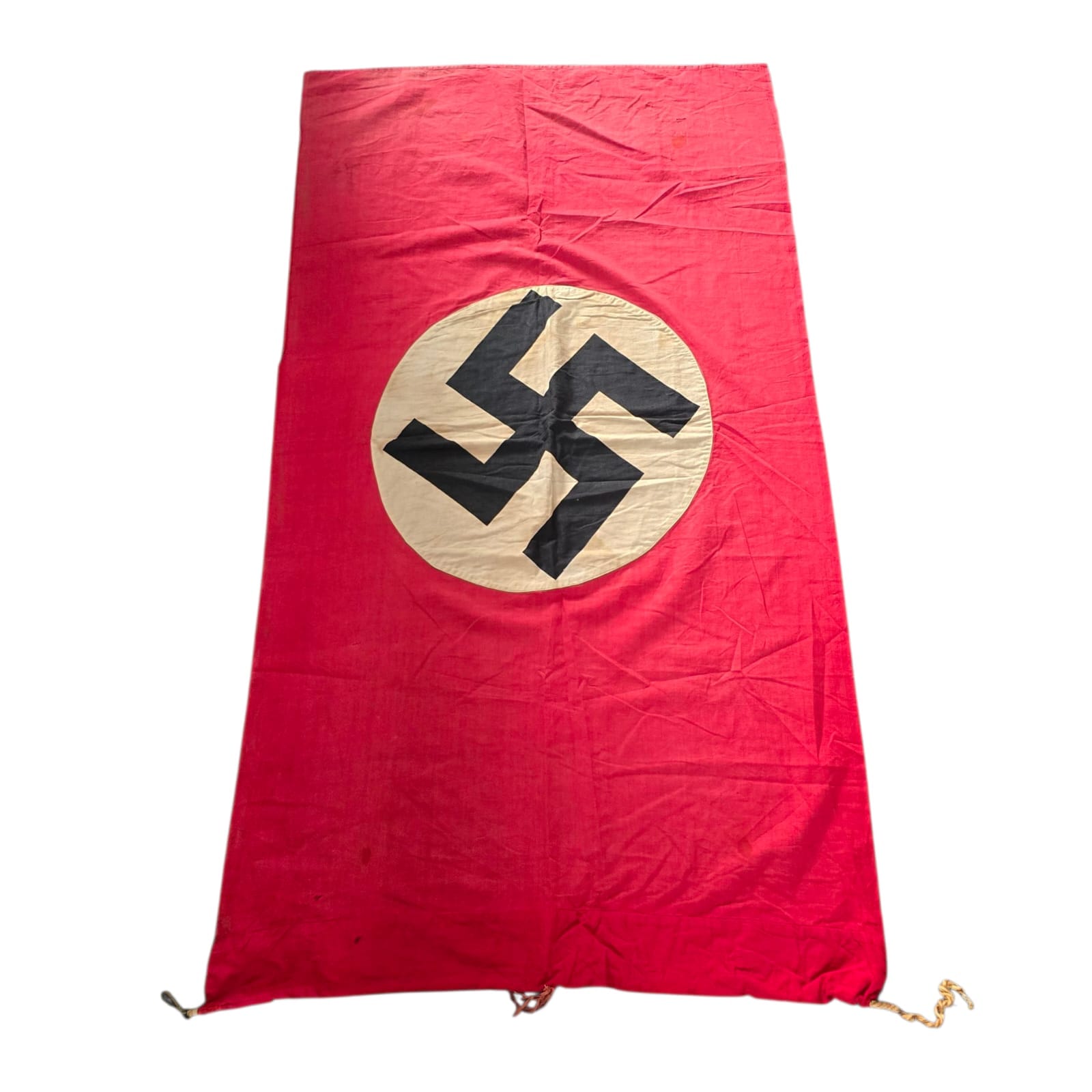 Item: In Nazi Germany, a house flag (Hausfahne) was a banner or flag displayed by private citizens, businesses, or institutions to show support for the regime, especially on official holidays, parades, or visits by leaders. These flags usually carried the swastika emblem in various forms (vertical banners, horizontal flags, or draped cloths). They were widely visible in towns and cities during the 1930s–1940s and served as a tool of propaganda, reinforcing loyalty and conformity.