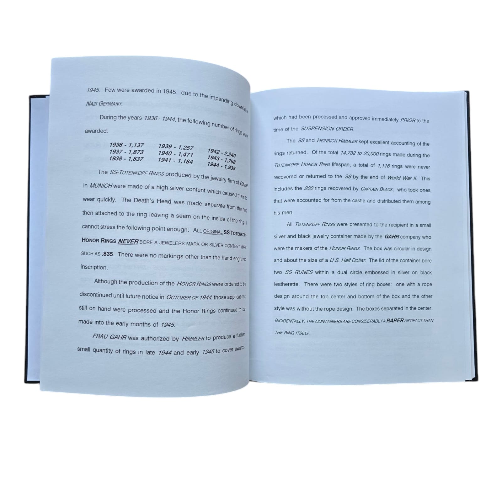 Het boek biedt lezers een diepgaand inzicht in de oorsprong, ontwerpelementen en de criteria voor toekenning van de ring. Daarnaast bevat het waardevolle informatie over het onderscheiden van authentieke ringen en reproducties, wat het een essentieel naslagwerk maakt voor verzamelaars en historici. De SS Totenkopf-ring, gemaakt van zilver en voorzien van een doodskopmotief met verschillende runensymbolen, werd beschouwd als een prestigieus eerbetoon binnen de SS. Elke ring droeg de achternaam van de ontvanger, de datum van toekenning en een facsimile van Himmlers handtekening aan de binnenkant.