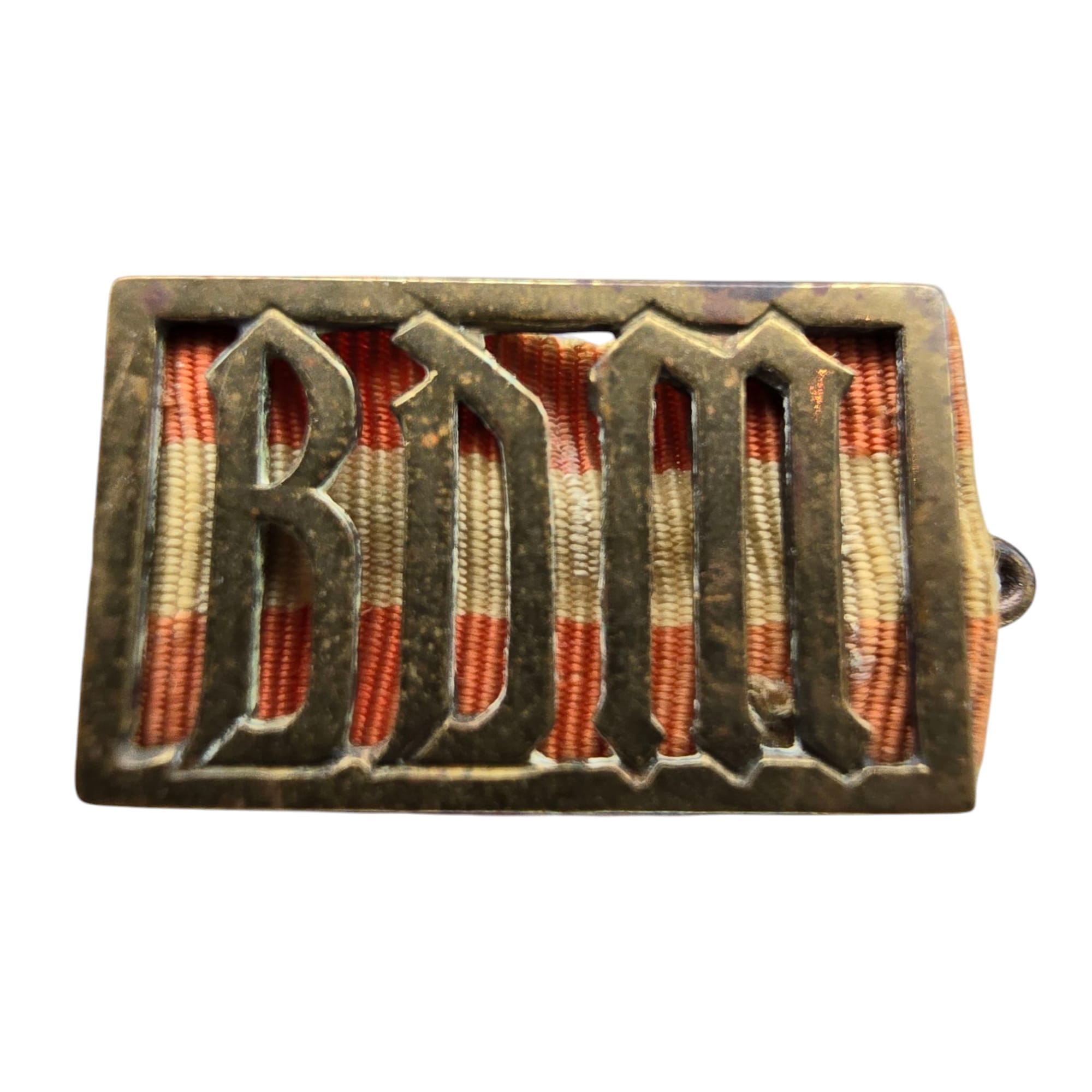 Item: BDM Sportbadge in Brons. De Bund Deutscher Mädel (BDM) was de meisjesafdeling van de Hitlerjugend, opgericht in 1930. Het had als doel om jonge Duitse meisjes (van 10–18 jaar) te indoctrineren met de nazi-ideologie, met de nadruk op fysieke fitheid, huishoudelijke vaardigheden en loyaliteit aan het regime. Activiteiten omvatten sport, kamperen en gemeenschapsdienst, ter voorbereiding op hun verwachte rol als moeders en ondersteuners van de nazistaat. Lidmaatschap werd verplicht in 1936, en de BDM speelde een belangrijke rol in de vorming van de jeugd in nazi-Duitsland.