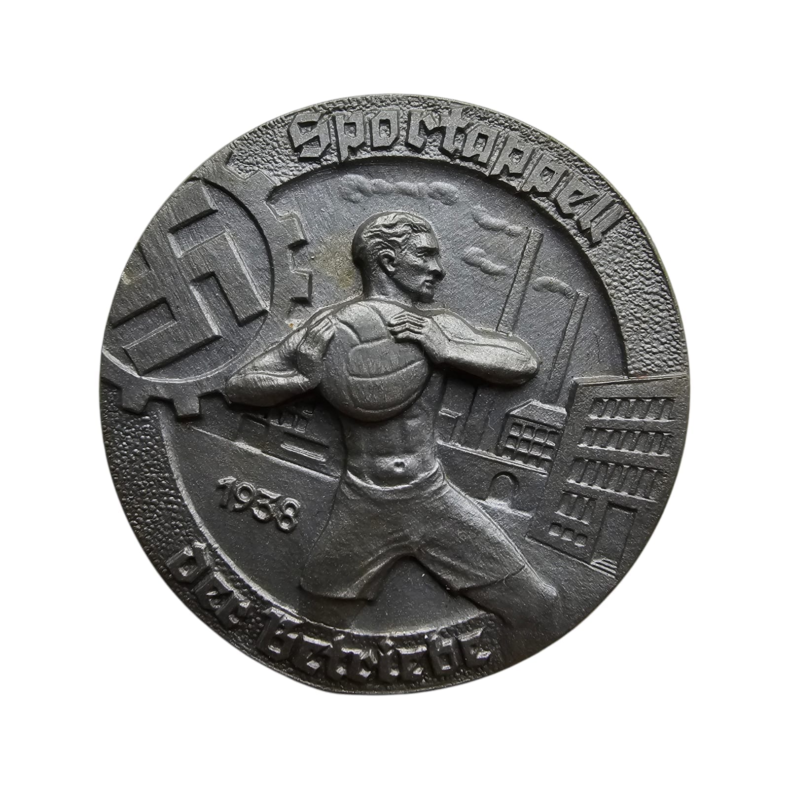 Item: The DAF Sportappel der Betriebe 1938 badge is an insignia issued by the Deutsche Arbeitsfront (DAF), the only official trade union organization in Nazi Germany, which unified labor organizations and businesses in Nazi Germany. The badge was awarded during sporting events organized by the DAF in 1938 and symbolized the appreciation for physical fitness, strength, and camaraderie among workers.