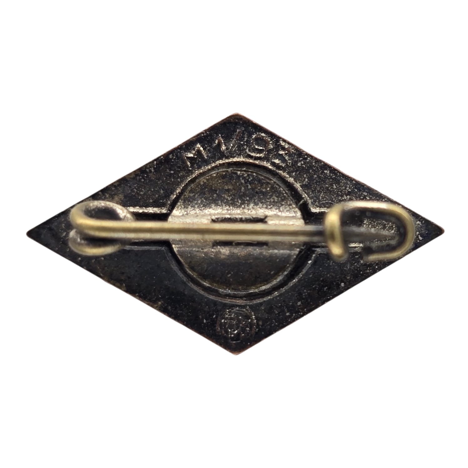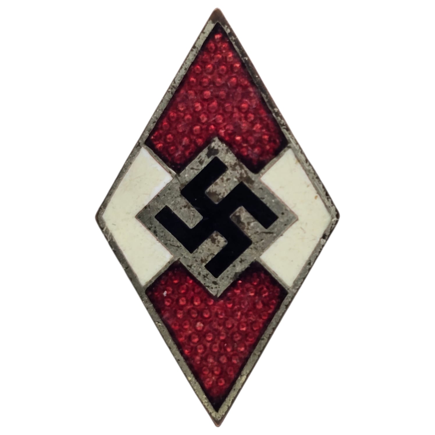 Item: The Hitler Youth (Hitlerjugend) Membership Badge was the official insignia worn by members of the Nazi youth organization. Introduced in the 1930s, it featured a red–white–black diamond design with a black swastika in the center. It symbolized loyalty to the Hitler Youth and the Nazi Party, and was worn on civilian clothes or uniforms.