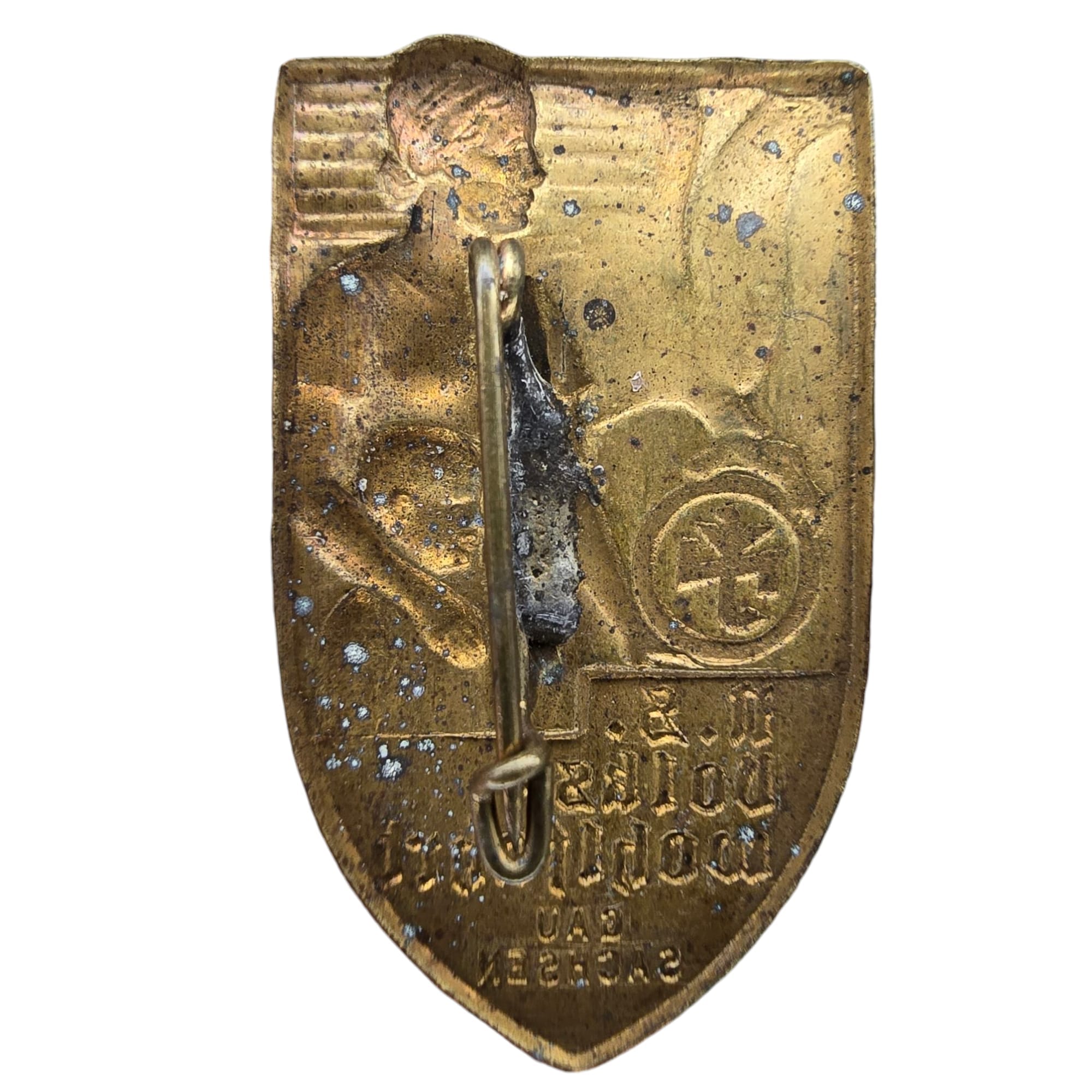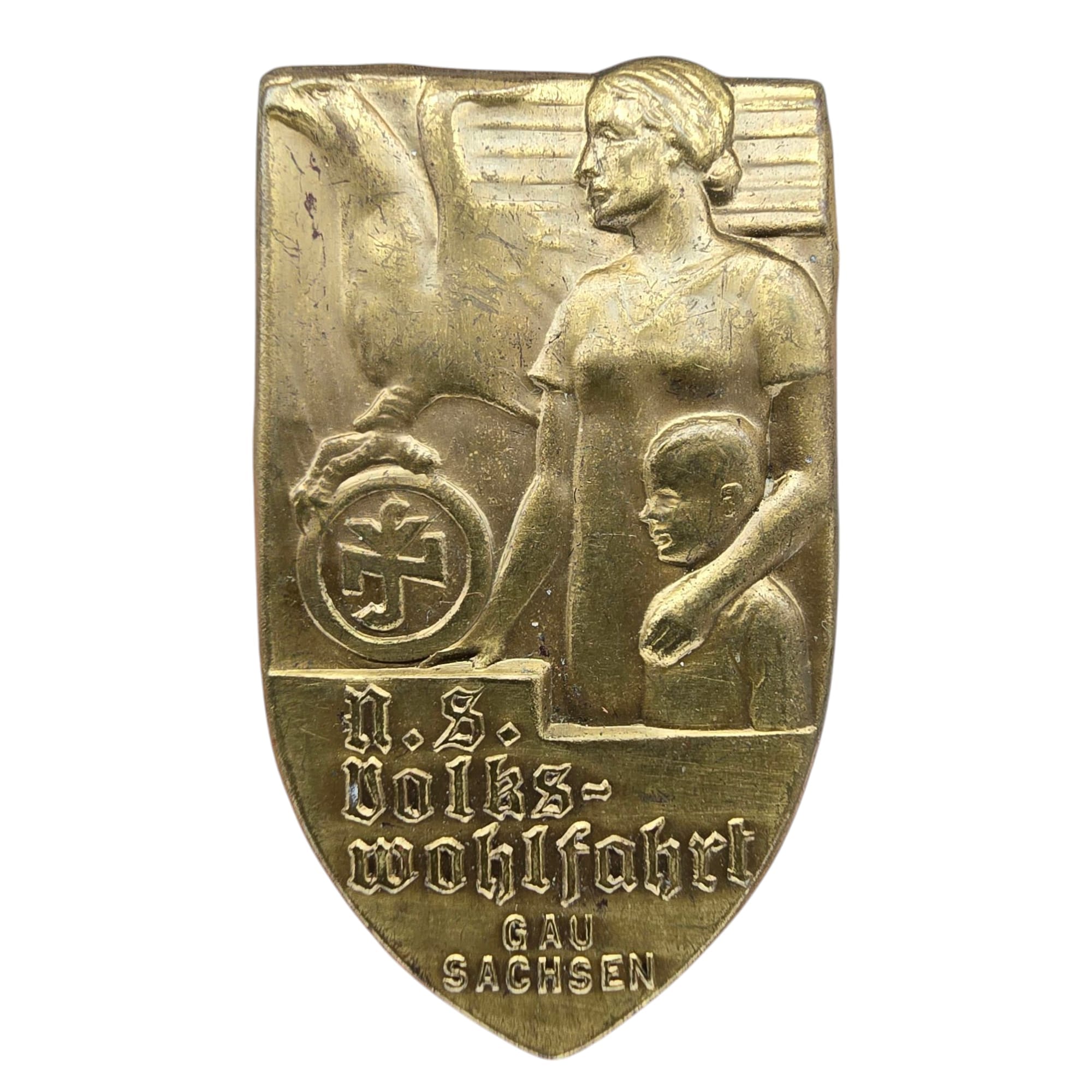 Item: The N.S. Volkswohlfahrt (NSV) Gau Sachsen tinnie was a small pin or badge issued by the Nazi Party’s National Socialist People’s Welfare organization (Nationalsozialistische Volkswohlfahrt). It was used for fundraising and propaganda purposes, particularly in the Gau (district) of Sachsen.