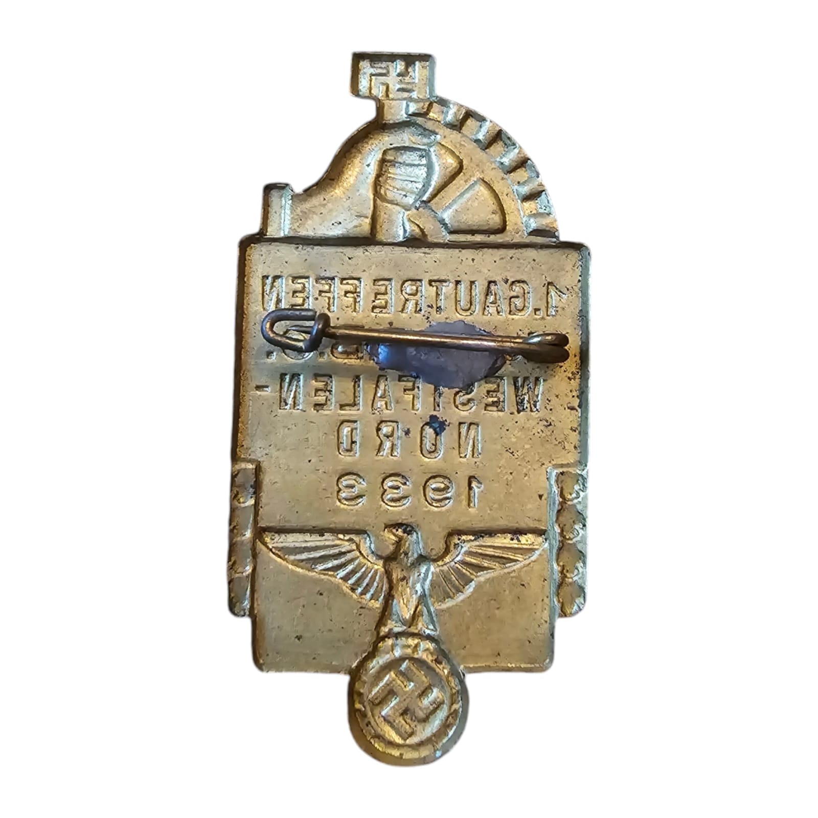 Item: The NSBO tinnies (German: Nationalsozialistische Betriebszellenorganisation) were small metal pins issued by the Nazi Party as part of propaganda initiatives within German workplaces and factories. The NSBO, or “National Socialist Factory Cell Organization,” served as the trade union division of the Nazi Party. It aimed to organize workers and factory employees and influence them ideologically, with the goal of bringing trade unions under Nazi control.