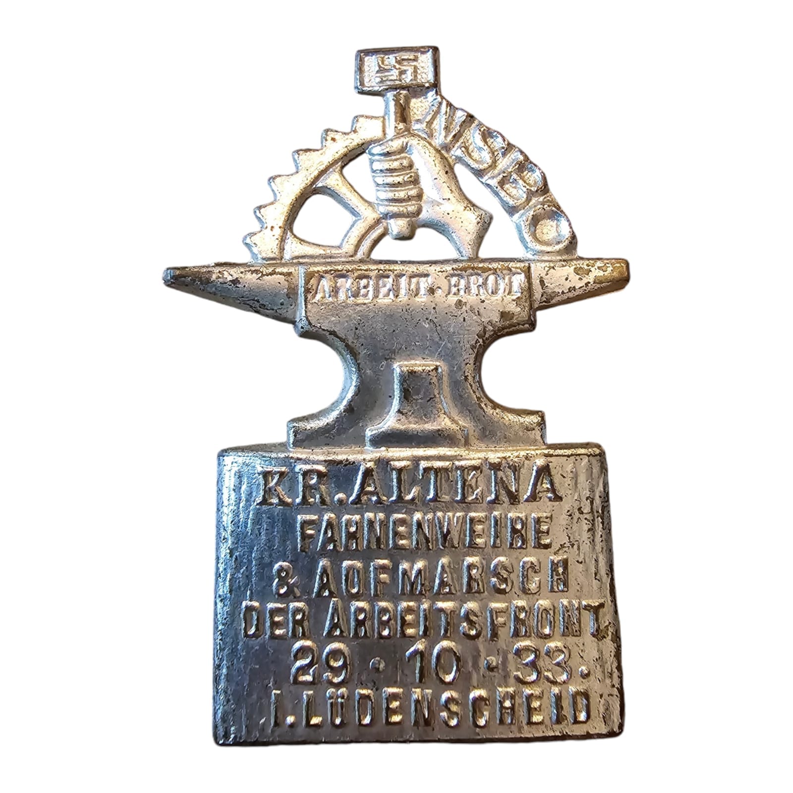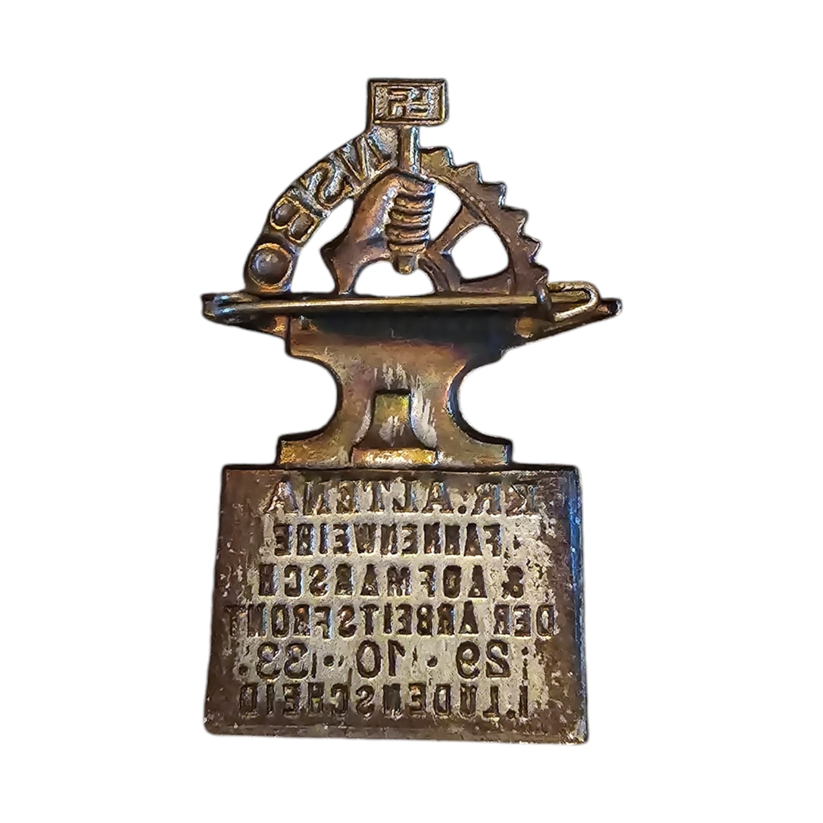 Item: The NSBO tinnies (German: Nationalsozialistische Betriebszellenorganisation) were small metal pins issued by the Nazi Party as part of propaganda initiatives within German workplaces and factories. The NSBO, or “National Socialist Factory Cell Organization,” served as the trade union division of the Nazi Party. It aimed to organize workers and factory employees and influence them ideologically, with the goal of bringing trade unions under Nazi control.