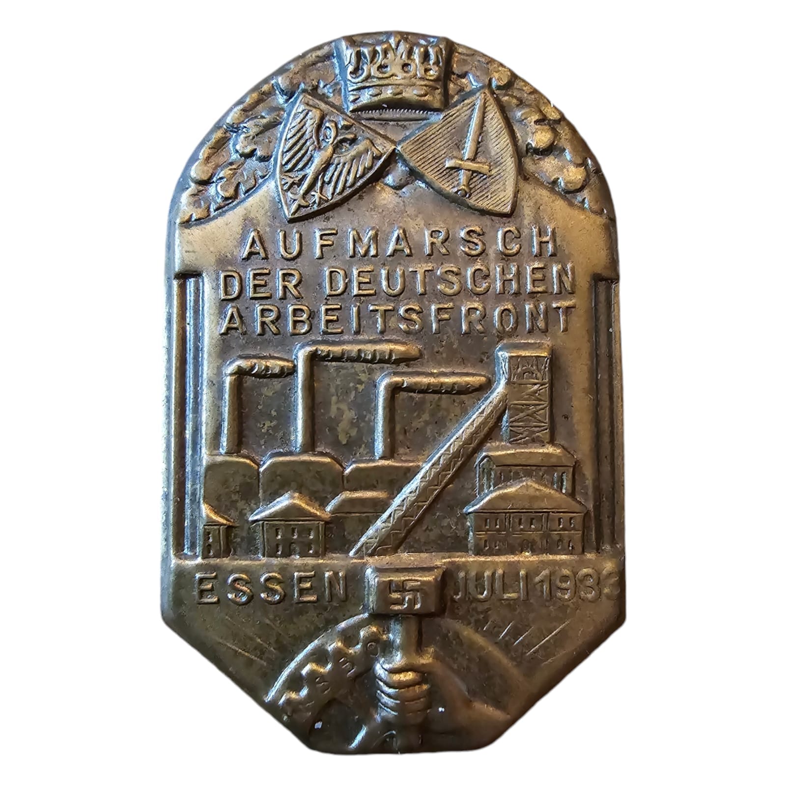Item: The NSBO tinnies (German: Nationalsozialistische Betriebszellenorganisation) were small metal pins issued by the Nazi Party as part of propaganda initiatives within German workplaces and factories. The NSBO, or “National Socialist Factory Cell Organization,” served as the trade union division of the Nazi Party. It aimed to organize workers and factory employees and influence them ideologically, with the goal of bringing trade unions under Nazi control.