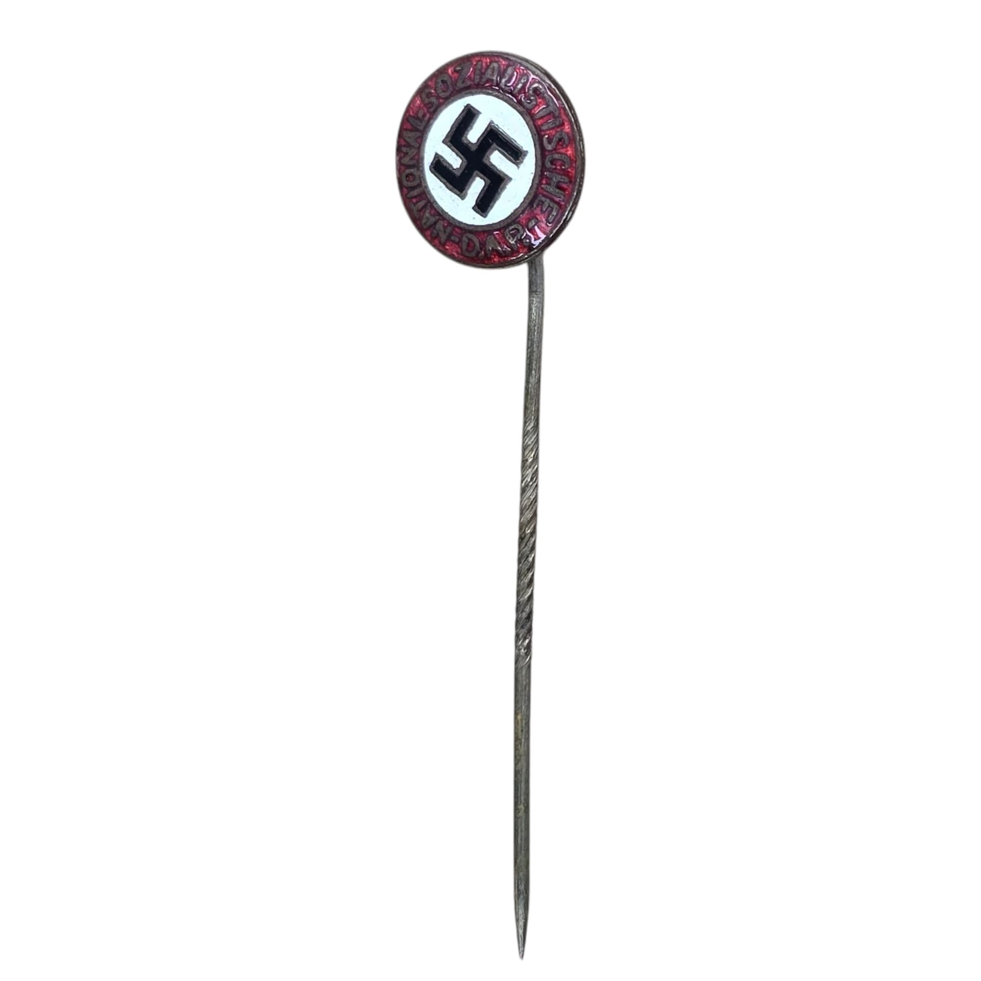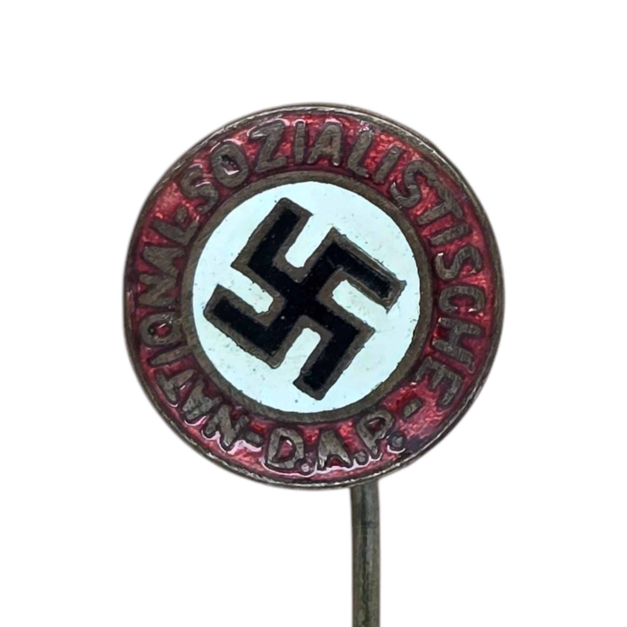 Item: The NSDAP Membership Badge (Parteiabzeichen) was worn by all members of the Nazi Party, on the lapel of civilian clothes, or in some cases on uniforms. The origins of the badge date back to the early days of the NSDAP, and there is much variation among the earliest examples, though this was soon standardized into the form of an enamel pin featuring a black swastika on a white roundel, surrounded by the inscription “National-Sozialistische D.A.P.,” the official name of the National Socialist German Workers’ Party, within a red enamel border. Beginning in 1934, manufacture of the NSDAP membership pins was controlled by the Reichszeugmeisterei, and the reverses of the badges were marked with the RZM logo and maker codes. At some point after the outbreak of WWII, the manufacture of the fine enamel membership pins ceased, and pins were made of silver finished zinc, with painted rather than enameled decoration. Most NSDAP enamel pins had a soldered pin on the reverse, though they were also available with a flat round fitting that allowed the badge to be worn in a buttonhole. Because so many Germans were members of the NSDAP, millions of these pins were made, though some rare variants and early types are hard to find. Even the most common examples are popular among collectors, because of the historical value as well as the iconic, striking design. This party badge is a early unmarked version