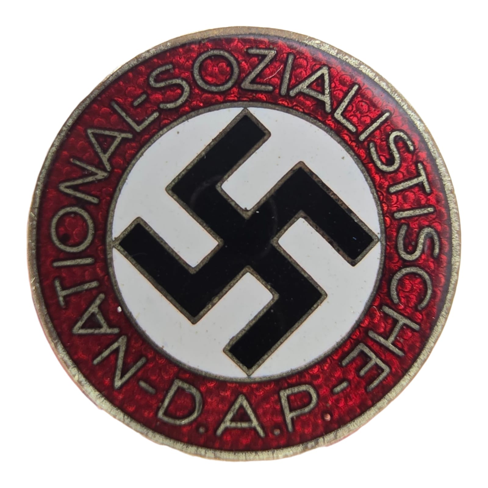 De NSDAP-lidmaatschapsbadge (Parteiabzeichen) werd door alle leden van de nazi-partij gedragen, op de revers van burgerkleding, of in sommige gevallen op uniformen. De oorsprong van het insigne gaat terug tot de begindagen van de NSDAP, en er is veel variatie tussen de vroegste voorbeelden, hoewel dit al snel werd gestandaardiseerd in de vorm van een geëmailleerde pin met een zwarte swastika op een wit rondel, omgeven door de inscriptie “Nationaal-Sozialistische D.A.P.”, de officiële naam van de Nationaal-Socialistische Duitse Arbeiderspartij, binnen een rood geëmailleerde rand. Vanaf 1934 werd de vervaardiging van de NSDAP-lidmaatschapsspelden gecontroleerd door de Reichszeugmeisterei, en de achterkant van de insignes werd gemarkeerd met het RZM-logo en de makercodes. Op een bepaald moment na het uitbreken van de Tweede Wereldoorlog stopte de productie van de fijne geëmailleerde lidmaatschapsspelden en werden de spelden gemaakt van met zilver afgewerkt zink, met geschilderde in plaats van geëmailleerde decoraties. De meeste NSDAP-emaillespelden hadden een gesoldeerde pin aan de achterkant, maar ze waren ook verkrijgbaar met een platte ronde fitting waardoor de badge in een knoopsgat kon worden gedragen. Omdat zoveel Duitsers lid waren van de NSDAP, zijn er miljoenen van deze speldjes gemaakt, hoewel sommige zeldzame varianten en vroege typen moeilijk te vinden zijn. Zelfs de meest voorkomende exemplaren zijn populair onder verzamelaars, vanwege de historische waarde en het iconische, opvallende ontwerp. Deze badge is aan de achterkant gemarkeerd met RZM