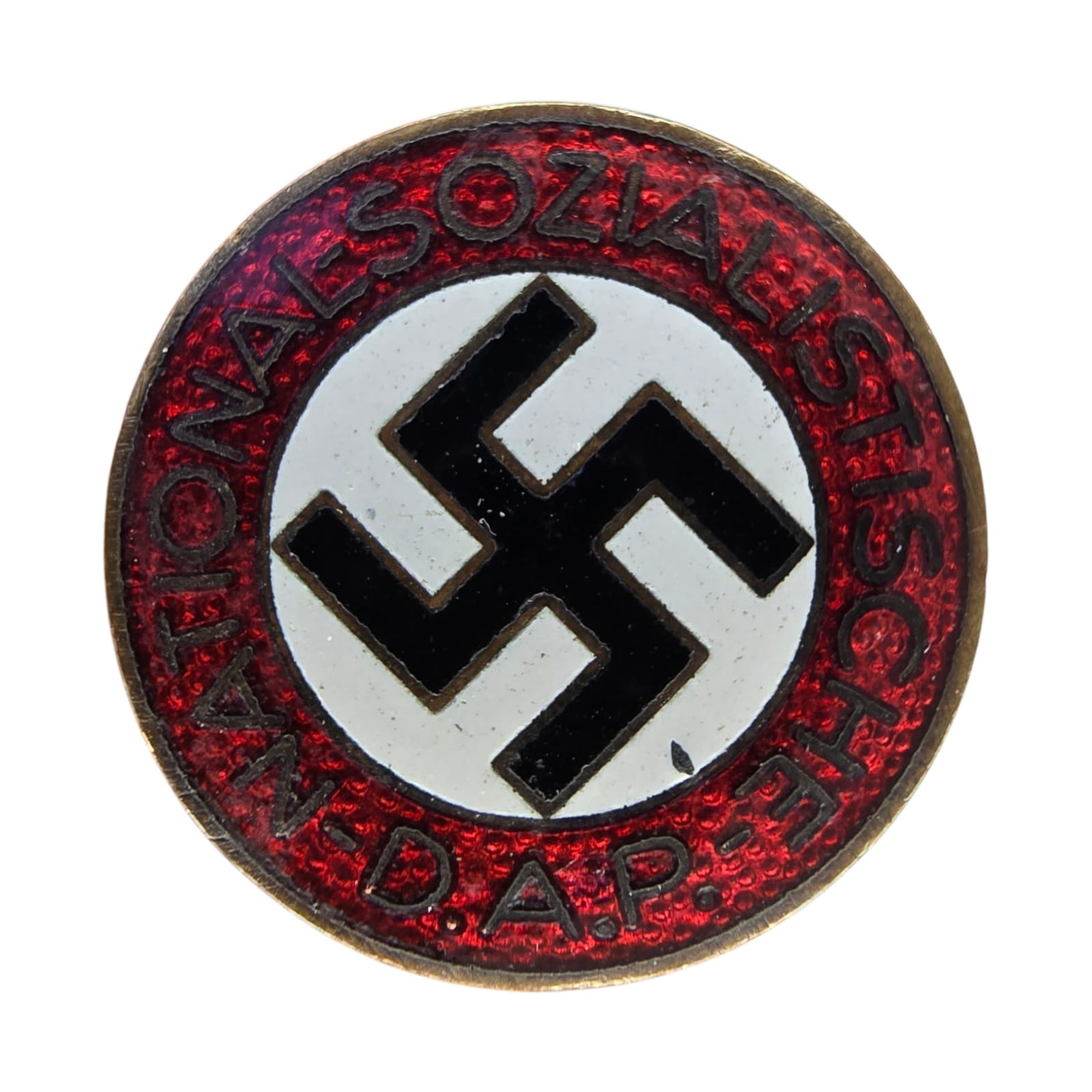 De NSDAP-lidmaatschapsbadge (Parteiabzeichen) werd door alle leden van de nazi-partij gedragen, op de revers van burgerkleding, of in sommige gevallen op uniformen. De oorsprong van het insigne gaat terug tot de begindagen van de NSDAP, en er is veel variatie tussen de vroegste voorbeelden, hoewel dit al snel werd gestandaardiseerd in de vorm van een geëmailleerde pin met een zwarte swastika op een wit rondel, omgeven door de inscriptie “Nationaal-Sozialistische D.A.P.”, de officiële naam van de Nationaal-Socialistische Duitse Arbeiderspartij, binnen een rood geëmailleerde rand. Vanaf 1934 werd de vervaardiging van de NSDAP-lidmaatschapsspelden gecontroleerd door de Reichszeugmeisterei, en de achterkant van de insignes werd gemarkeerd met het RZM-logo en de makercodes. Op een bepaald moment na het uitbreken van de Tweede Wereldoorlog stopte de productie van de fijne geëmailleerde lidmaatschapsspelden en werden de spelden gemaakt van met zilver afgewerkt zink, met geschilderde in plaats van geëmailleerde decoraties. De meeste NSDAP-emaillespelden hadden een gesoldeerde pin aan de achterkant, maar ze waren ook verkrijgbaar met een platte ronde fitting waardoor de badge in een knoopsgat kon worden gedragen. Omdat zoveel Duitsers lid waren van de NSDAP, zijn er miljoenen van deze speldjes gemaakt, hoewel sommige zeldzame varianten en vroege typen moeilijk te vinden zijn. Zelfs de meest voorkomende exemplaren zijn populair onder verzamelaars, vanwege de historische waarde en het iconische, opvallende ontwerp. Deze badge is aan de achterkant gemarkeerd met RZM