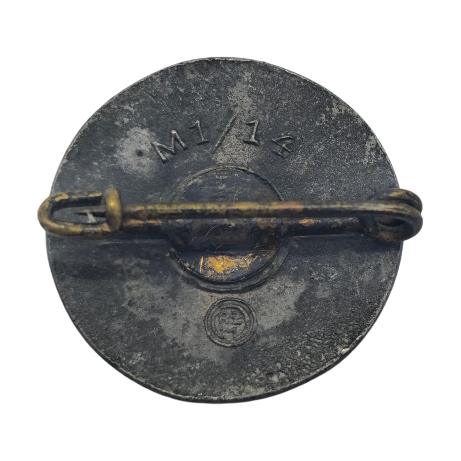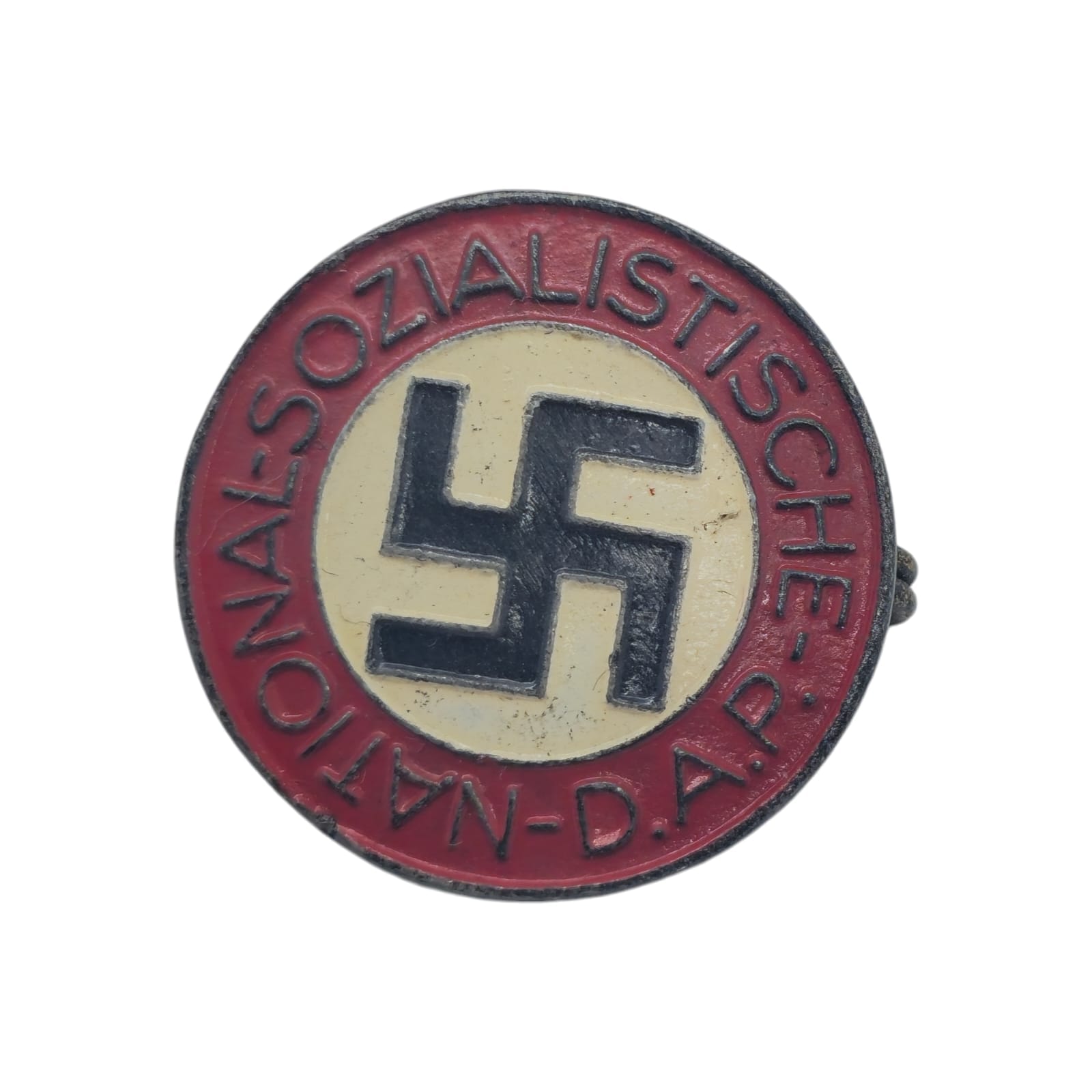 De NSDAP-lidmaatschapsbadge (Parteiabzeichen) werd door alle leden van de nazi-partij gedragen, op de revers van burgerkleding, of in sommige gevallen op uniformen. De oorsprong van het insigne gaat terug tot de begindagen van de NSDAP, en er is veel variatie tussen de vroegste voorbeelden, hoewel dit al snel werd gestandaardiseerd in de vorm van een geëmailleerde pin met een zwarte swastika op een wit rondel, omgeven door de inscriptie “Nationaal-Sozialistische D.A.P.”, de officiële naam van de Nationaal-Socialistische Duitse Arbeiderspartij, binnen een rood geëmailleerde rand. Vanaf 1934 werd de vervaardiging van de NSDAP-lidmaatschapsspelden gecontroleerd door de Reichszeugmeisterei, en de achterkant van de insignes werd gemarkeerd met het RZM-logo en de makercodes. Op een bepaald moment na het uitbreken van de Tweede Wereldoorlog stopte de productie van de fijne geëmailleerde lidmaatschapsspelden en werden de spelden gemaakt van met zilver afgewerkt zink, met geschilderde in plaats van geëmailleerde decoraties. De meeste NSDAP-emaillespelden hadden een gesoldeerde pin aan de achterkant, maar ze waren ook verkrijgbaar met een platte ronde fitting waardoor de badge in een knoopsgat kon worden gedragen. Omdat zoveel Duitsers lid waren van de NSDAP, zijn er miljoenen van deze speldjes gemaakt, hoewel sommige zeldzame varianten en vroege typen moeilijk te vinden zijn. Zelfs de meest voorkomende exemplaren zijn populair onder verzamelaars, vanwege de historische waarde en het iconische, opvallende ontwerp. Deze badge is aan de achterkant gemarkeerd met RZM 1/14 Matthias Oechsler & Sohn