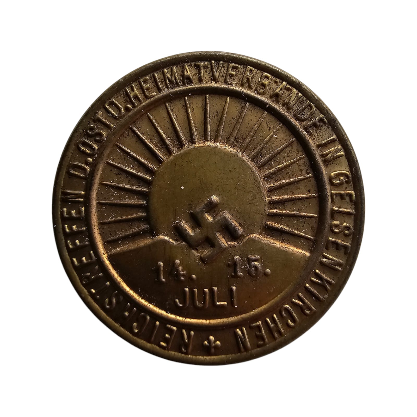 Item: De Reichstreffen D.Ostd Heimatverbände Gelsenkirchen 1935 tinnie is een belangrijk voorbeeld van de nazi-propaganda gericht op etnische Duitsers in het buitenland en de manieren waarop het regime probeerde een gevoel van verbondenheid en nationale identiteit te creëren, zelfs buiten de grenzen van Duitsland. Het vertegenwoordigt ook de culturele en politieke invloed die het nazi-regime probeerde uit te oefenen over de Duitse gemeenschappen die in Oost-Europa en andere delen van de wereld leefden.