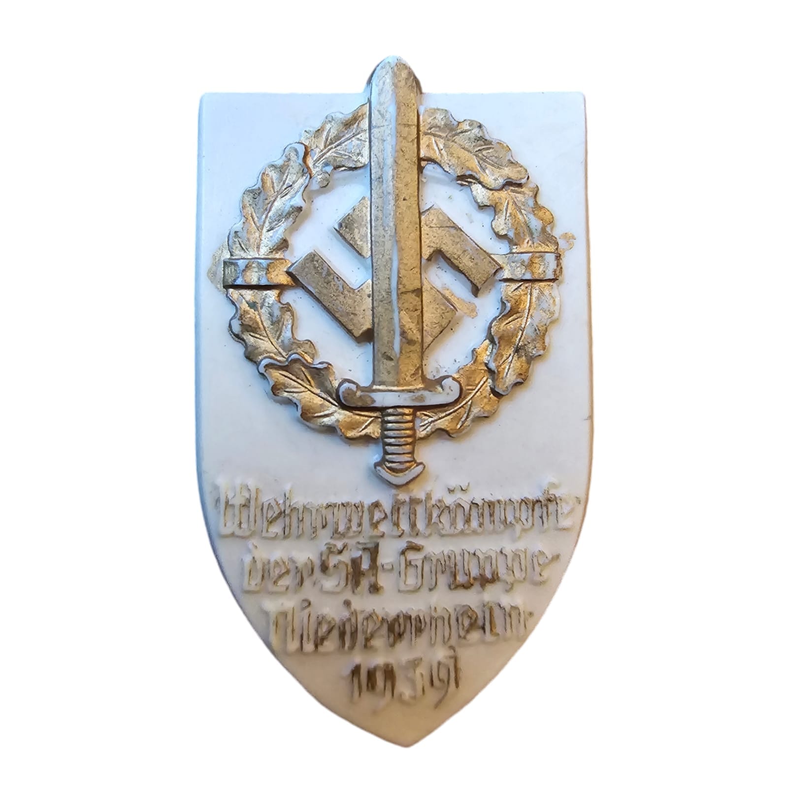 SA tinnies were often distributed during special SA events, marches, sports competitions, and party rallies, and were meant to foster camaraderie and pride within the SA. They frequently featured SA symbols, such as daggers (symbolizing loyalty), eagles, and swastikas. The date and location of the event were sometimes also inscribed on the tinnie, making these small badges a form of keepsake for those who participated.