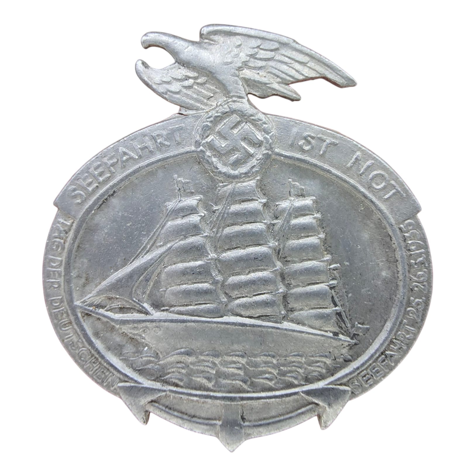 Item: The “Seefahrt ist Not Tinnie 1935 Maker Marked Gebr. Gloerfeld” day was a Nazi-era propaganda event promoting Germany’s maritime industry and naval expansion. The phrase, meaning “Seafaring is Necessary,” was originally from a 1913 novel by Gorch Fock but was later adopted by the Nazi regime. The event aimed to glorify the merchant fleet and navy, emphasizing their importance to Germany’s economy and military power. Commemorative tinnies (badges) were issued for the occasion, similar to other Nazi propaganda events. this Tinnie is Maker Marked with Gebr. Gloerfeld