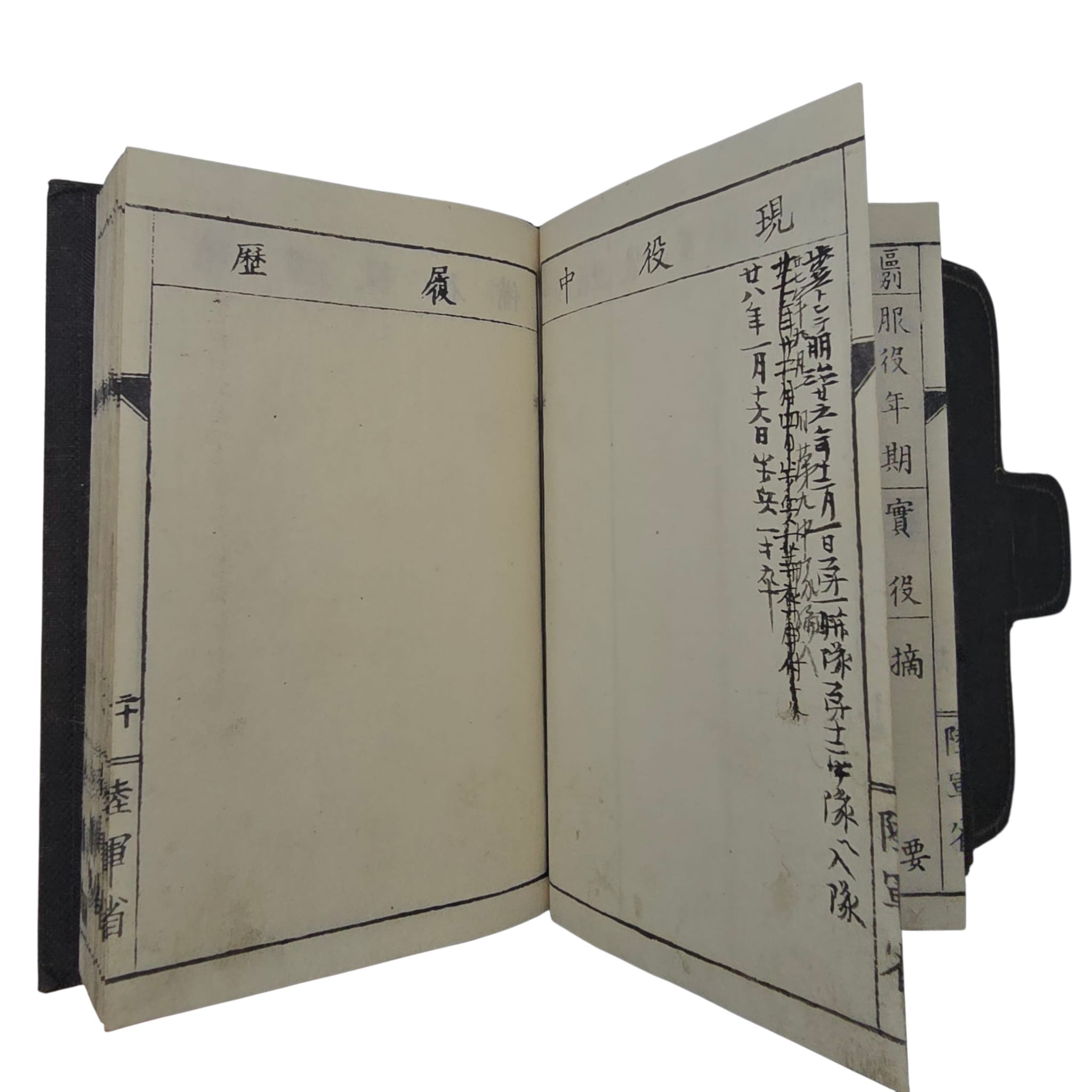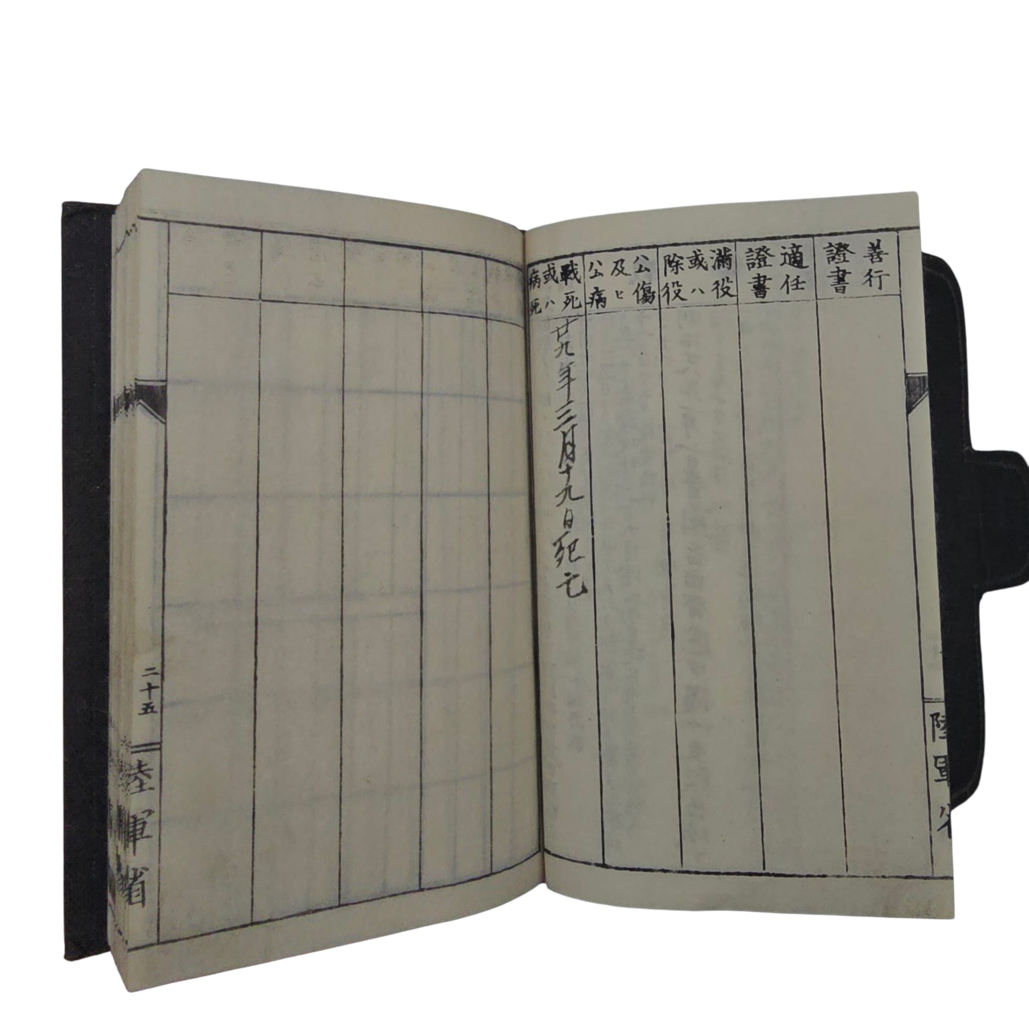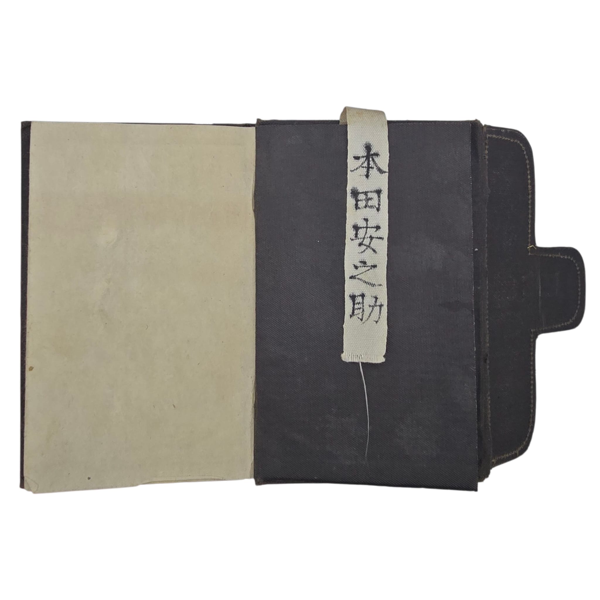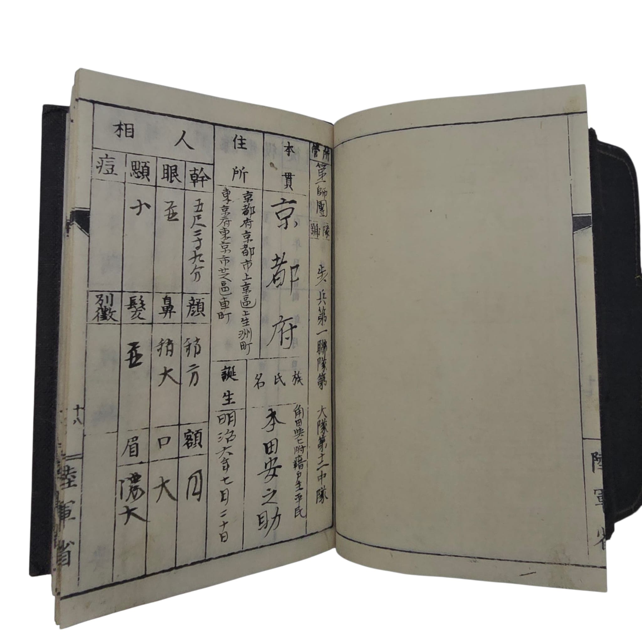Item: During the Second World War and earlier conflicts, Japanese soldiers received a military pocketbook (軍隊手帳 – Guntai Techō). This was their official identity and service booklet, which they were required to carry at all times. It contained personal information, military unit and rank, training records, equipment details, medical information, and service history stamps. Many booklets also included personal notes or good luck charms. It was an important military document, comparable to the German Soldbuch.