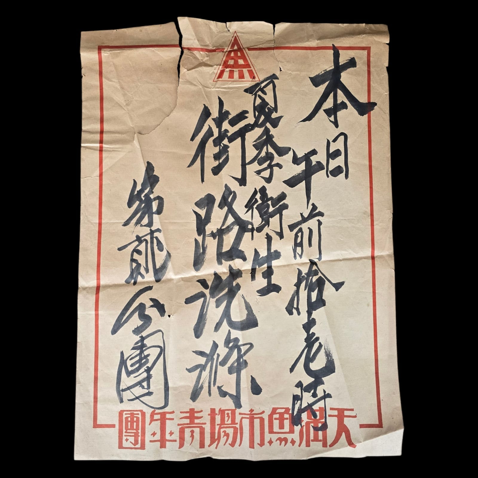 Item: The poster announces a mandatory activity for citizens, most likely street or neighborhood cleaning. Posters like this were commonly displayed during wartime by local civil organizations such as the “Tonarigumi” (隣組) — neighborhood groups that operated under supervision of the Japanese government and carried out tasks such as maintaining order, cleaning, monitoring for “suspicious elements,” and supporting the military.